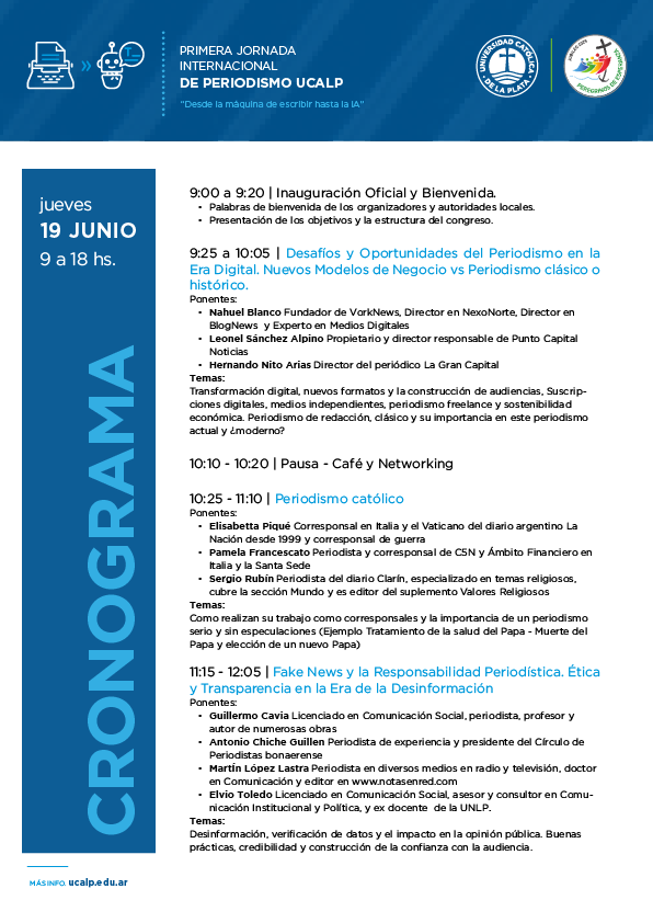 Además, se sumarán mesas específicas sobre periodismo religioso, investigación y verificación de datos, con voces como Elisabetta Piqué, Sergio Rubín, Bárbara Dibene y Facundo Bañez. El objetivo: pensar soluciones concretas en un ecosistema mediático cada vez más complejo.